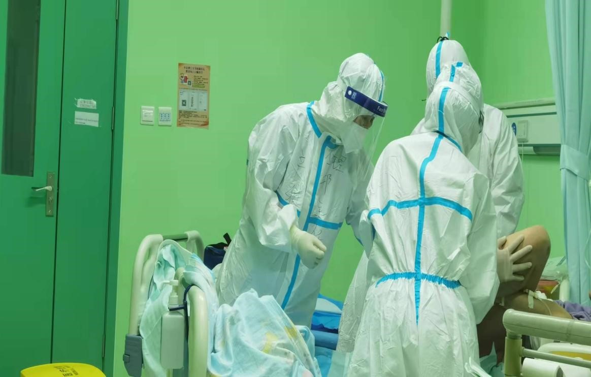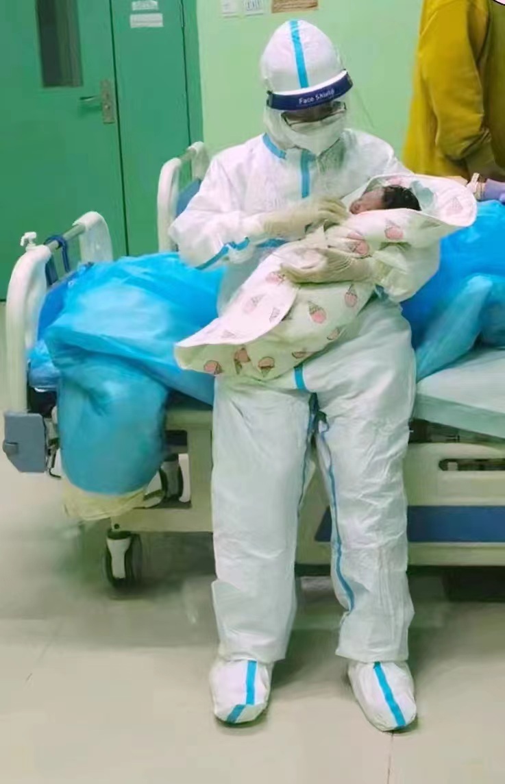 各个科室争分夺秒为孕妇开绿灯。发热门诊休息区的护士得知孕妇宫缩无力,没有力气的消息给孕妇送来巧克力。孕妇生产全程,妇产科邢军主任和赵芳菲护士长穿着厚重密不透气的防护服不停地忙碌,孕妇没劲时邢军主任跪在产床上用力帮助孕妇生产,汗水湿透了她们全身。当日19时45分,该孕妇顺利诞下一名男婴,母子平安。