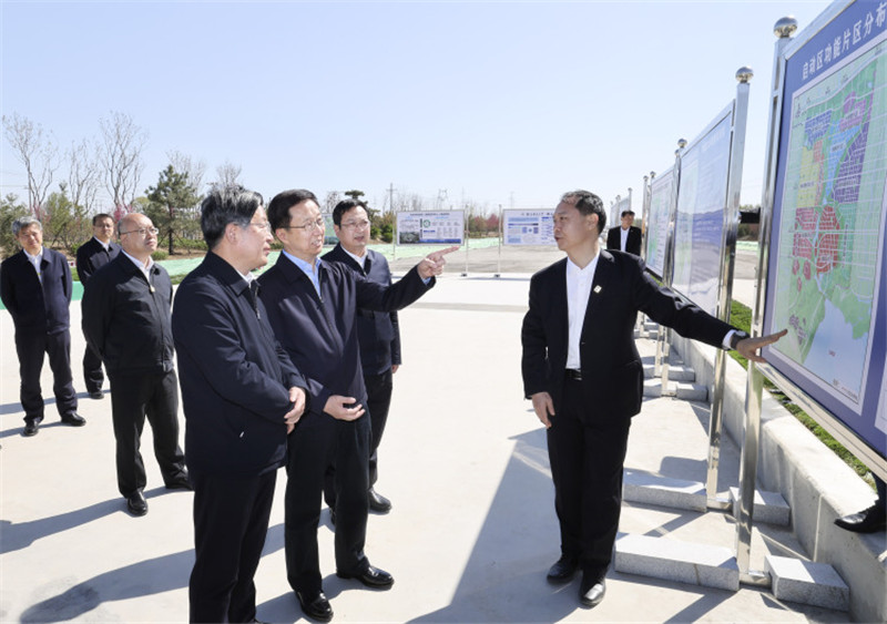 4月15日,中共中央政治局常委、国务院副总理韩正到河北雄安新区调研,主持召开座谈会并讲话。这是韩正来到北京非首都功能疏解项目选址地块,仔细询问首批疏解高校和北京协和医院选址及工作对接情况。新华社记者庞兴雷摄