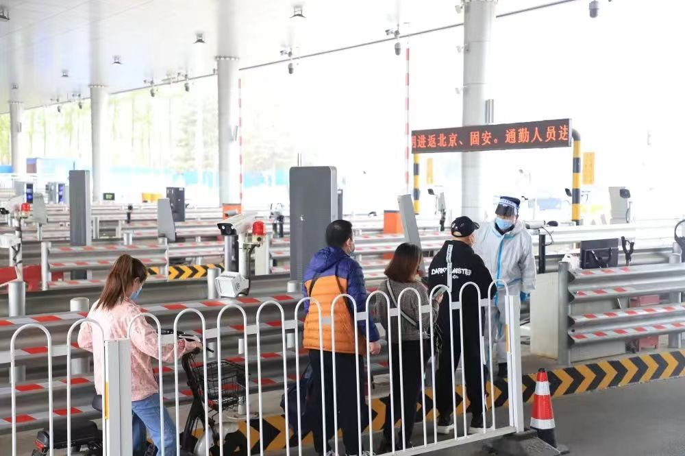 “根据疫情防控工作,4月11日零时起,固安县通勤人员恢复进返北京、固安。目前,坚持非通勤人员非必要不进京,如因重大疾病等极特殊原因确需进京的人员,需出示相应证明后进京,并严格执行北京市疫情防控政策。”固安县辛立村公安检查站站长徐立说。