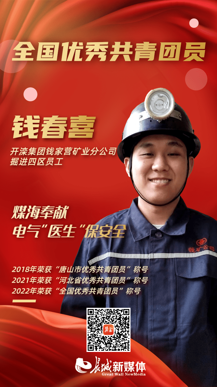 开滦集团钱家营矿业分公司掘进四区员工钱春喜,2018年荣获“唐山市优秀共青团员”称号,2021年荣获“河北省优秀共青团员”称号,2022年4月荣获“全国优秀共青团员”称号。