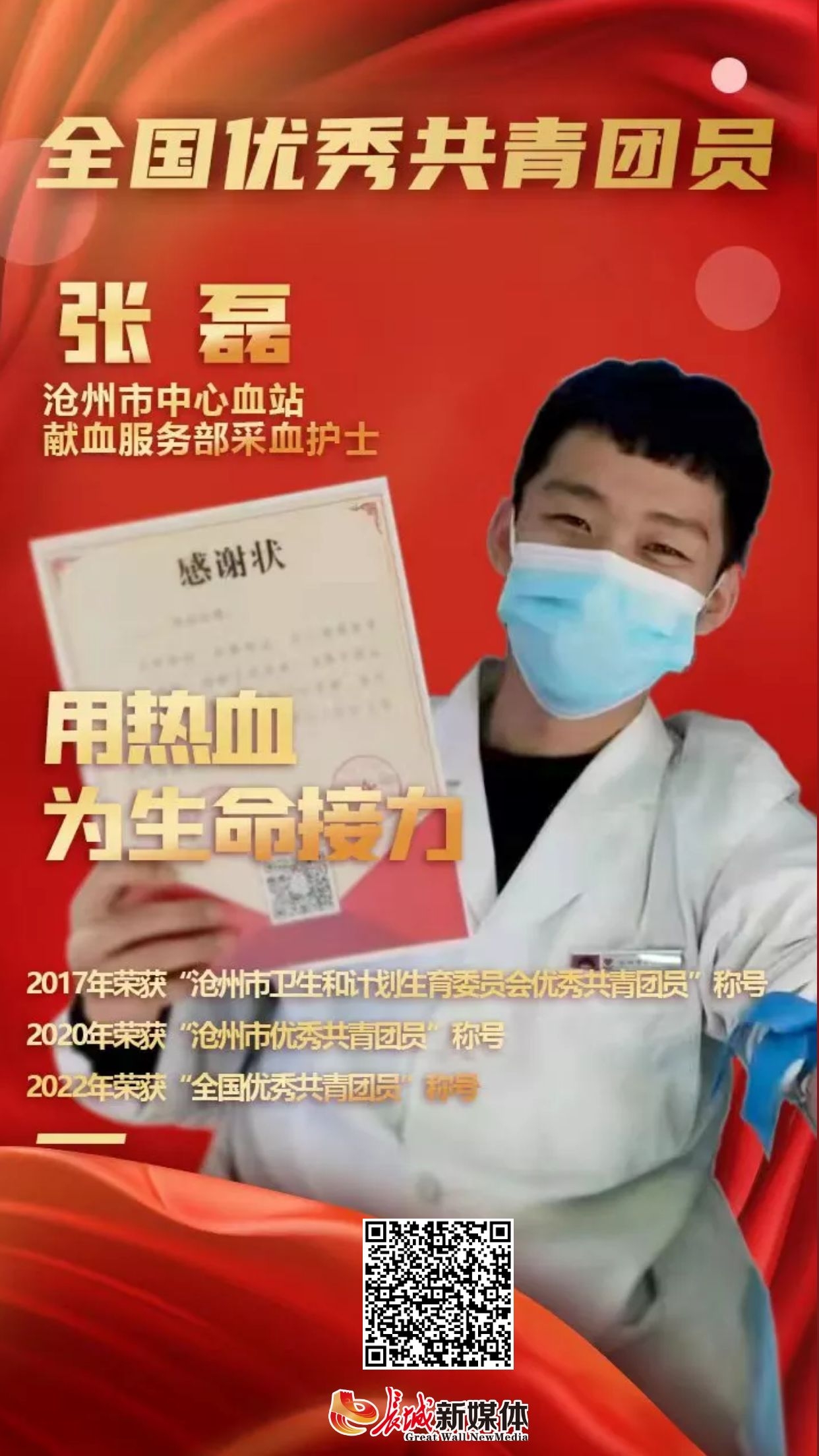 2022年是中国共青团成立100周年。近日,共青团中央下发关于表彰全国五四红旗团委(团支部)、全国优秀共青团员、全国优秀共青团干部的决定,沧州市中心血站献血服务部采血护士张磊获“全国优秀共青团员”称号。
