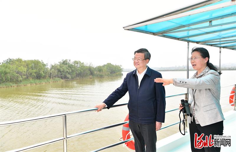 5月11日,省委书记倪岳峰在衡水市调研。这是倪岳峰在衡水湖国家级自然保护区乘船察看水质和水生物保护情况。 河北日报记者赵海江摄