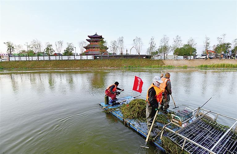 工作人员在运河南川楼段打捞杂草