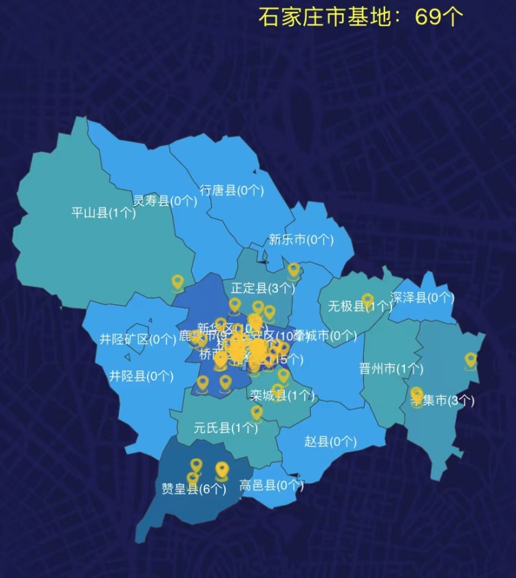 平台以全省及各地区地图为展示主基调,基于河北省地理信息,将科普示范基地的地址信息转化为地理坐标,在我省地图上对每家基地位置进行标识,并将相关数据信息嵌入其中。每个标识实际形成了一个可提取、可查看的数据模块,实现了个体数据与空间布局的有效关联。平台采用驾驶舱的展现模式,基于省、市、县和单个基地四级地图,从基地数量、星级分布、类型分布等多角度进行可视化展示。地图可逐级展开至每个基地坐标的具体位置,实现了数据与地图的实时联动及各分类间的有效互动,构建了横纵交错的空间立体化的数据展示体系。