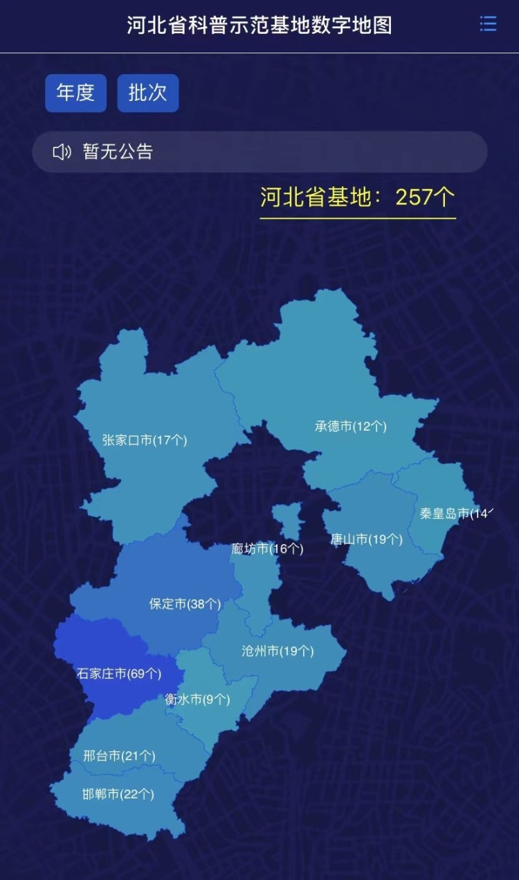为提升全省科普能力,充分发挥科普示范基地普及和传播科学文化的示范引领作用,全方位、立体化展现全省科普示范基地建设布局和科普资源情况,近日,由河北省科技厅组织开发的“河北省科普示范基地数字地图”展示平台正式上线。