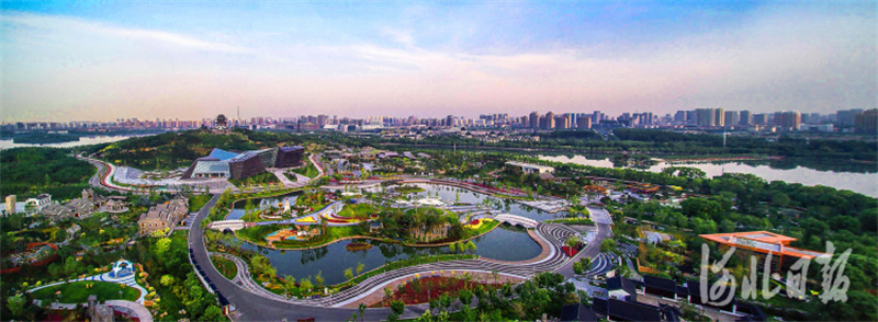 初夏时节,唐山南湖世园会园区晚樱绽放,杨柳依依。作为一张靓丽的城市名片,唐山市规划展览馆点缀在园区北侧。