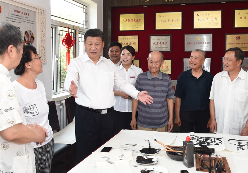2016年7月28日,中共中央总书记、国家主席、中央军委主席习近平到河北唐山市调研考察。这是习近平在唐山市祥富里社区文化活动室勉励正在进行书法绘画的社区居民。 新华社记者 谢环驰摄