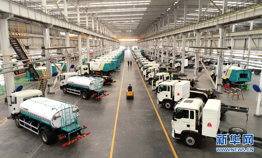石家庄煤矿机械有限责任公司车间内等待出厂的新能源环卫车。李继伟摄