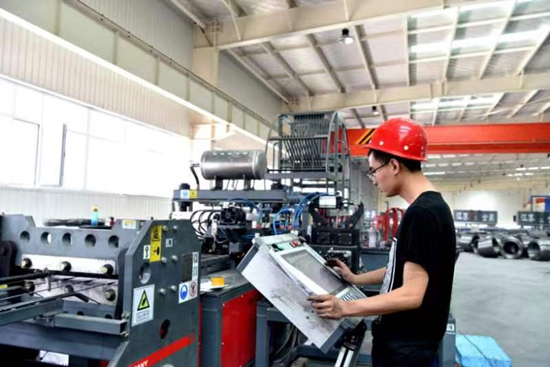 工人在定州市筑业装配式建筑产业基地查看机器运转情况。 曹立峰摄