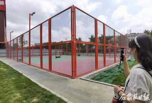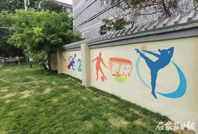随后,记者又来到了封龙大街(珠江大道-学苑路),看到道路西侧的围墙立面喷有以健身为主题的彩绘图,结合绿色的草坪,形成了一幅美丽画卷。不仅如此,封龙大街西侧在空地的基础上还建成了一座运动场,极大地方便了附近居民出行和健身的需求。高新区城市管理局公用事业管理处赵梦琪说:“考虑到东侧是石家庄学院及石家庄精英中学,南侧紧邻着多个居民区,这里的人员密度很大。为此,我们将封龙大街打造成以‘运动长廊’为主题的精品街道。新建了两处排球运动场地,并在周围增设了游园及运动步道。同时对440米围墙立面进行美化,注入运动风格的墙体彩绘元素,为市民提供健身娱乐场地,打造主题鲜明、相得益彰的街道景观。”