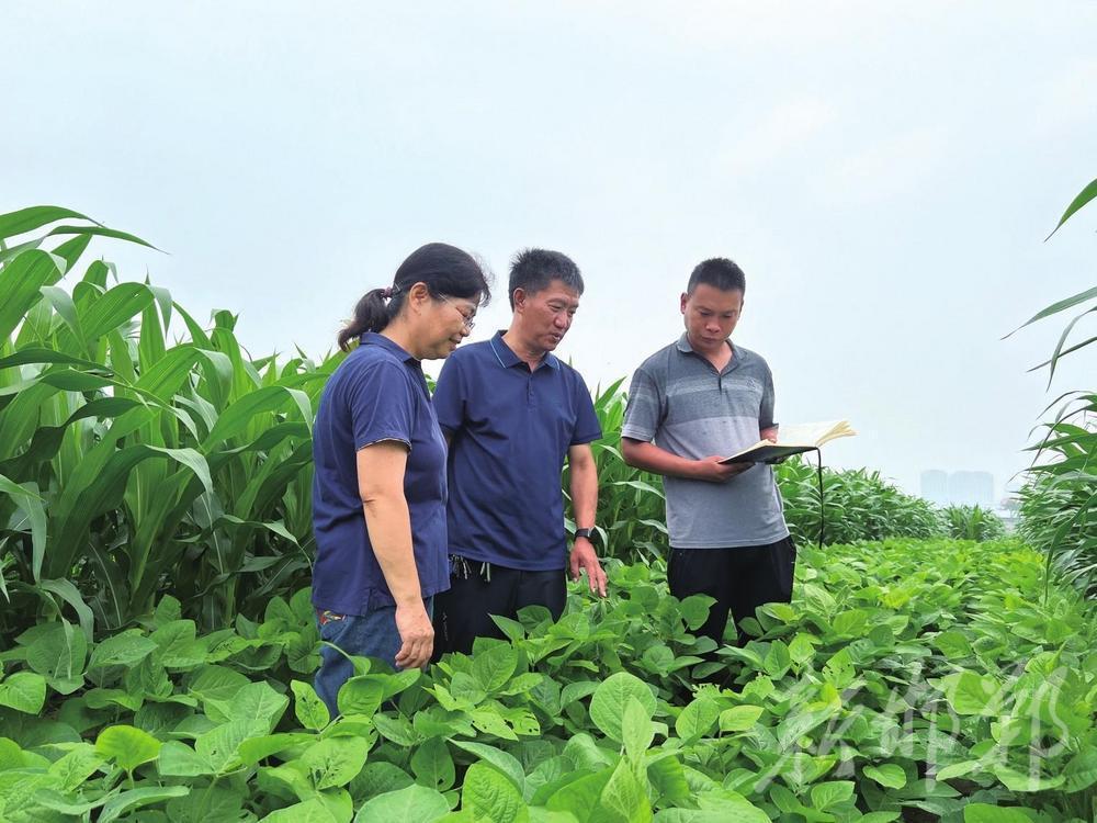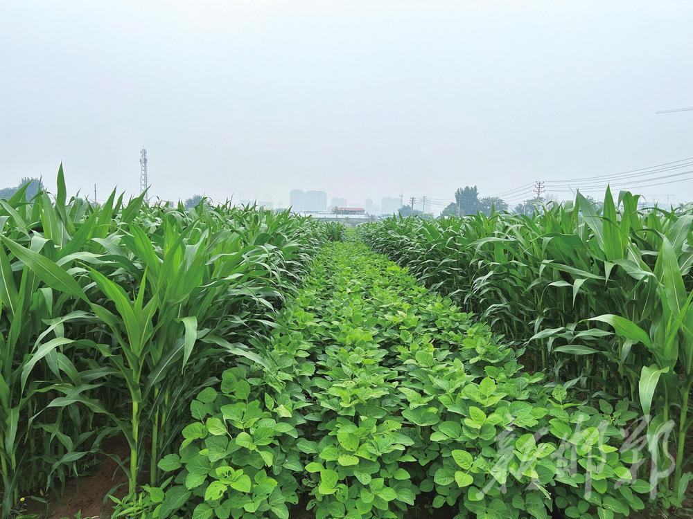 在邯郸市农业科学院大豆玉米带状复合种植试验田里,“邯豆13”品种主茎高度已到大腿,长势喜人。市农科院大豆研究室主任肖付明和研究员们边走边查看豆株的生长情况。“这片区域该浇水了,喷灌一下”,“这片区域需要治虫”……研究员周敬霄蹲下身仔细查看豆株,研究员王涛则将实验情况记录下来。这些豆种已广泛种植在冀中南大地上,助力农户走上致富路。