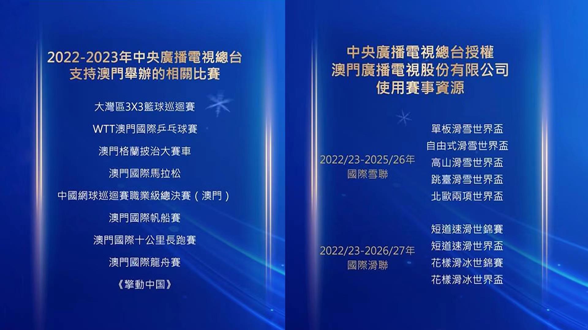 中央广播电视总台编务会议成员薛继军与澳门特别行政区社会文化司司长欧阳瑜共同发布了《2022-2023年中央广播电视总台与澳门特别行政区赛事合作目录》,双方将进一步强化在体育赛事举办和赛事资源授权方面的合作。