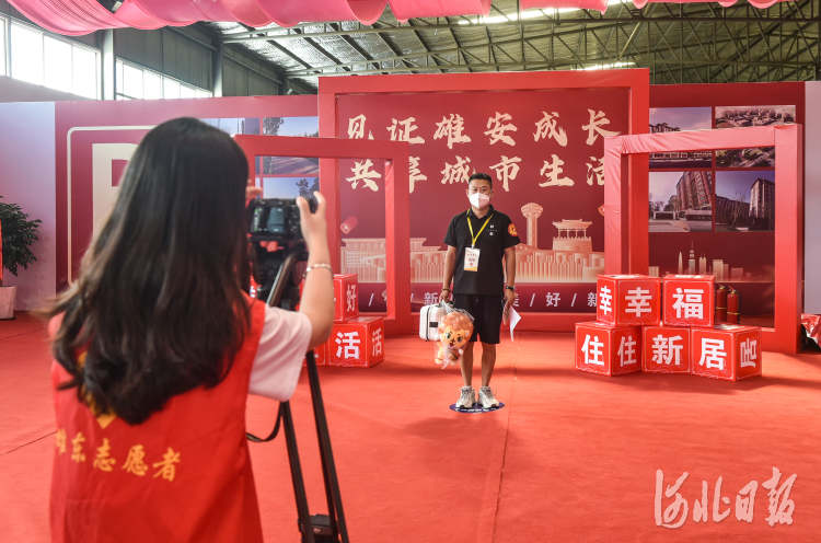 8月15日,雄东片区首批安置住房分配现场摇号工作摇号区,居民在摇号完成后拍照留念。 河北日报记者李东宇摄