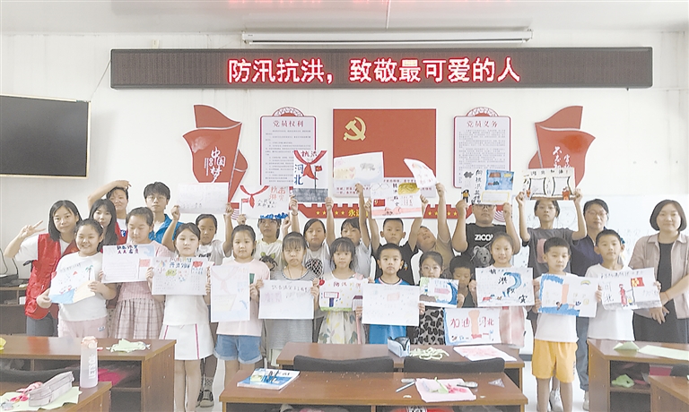 在小里镇社工站社工带领下,孩子们用五彩画笔表达对防汛抗洪人员的感激之情。宁立静 供图